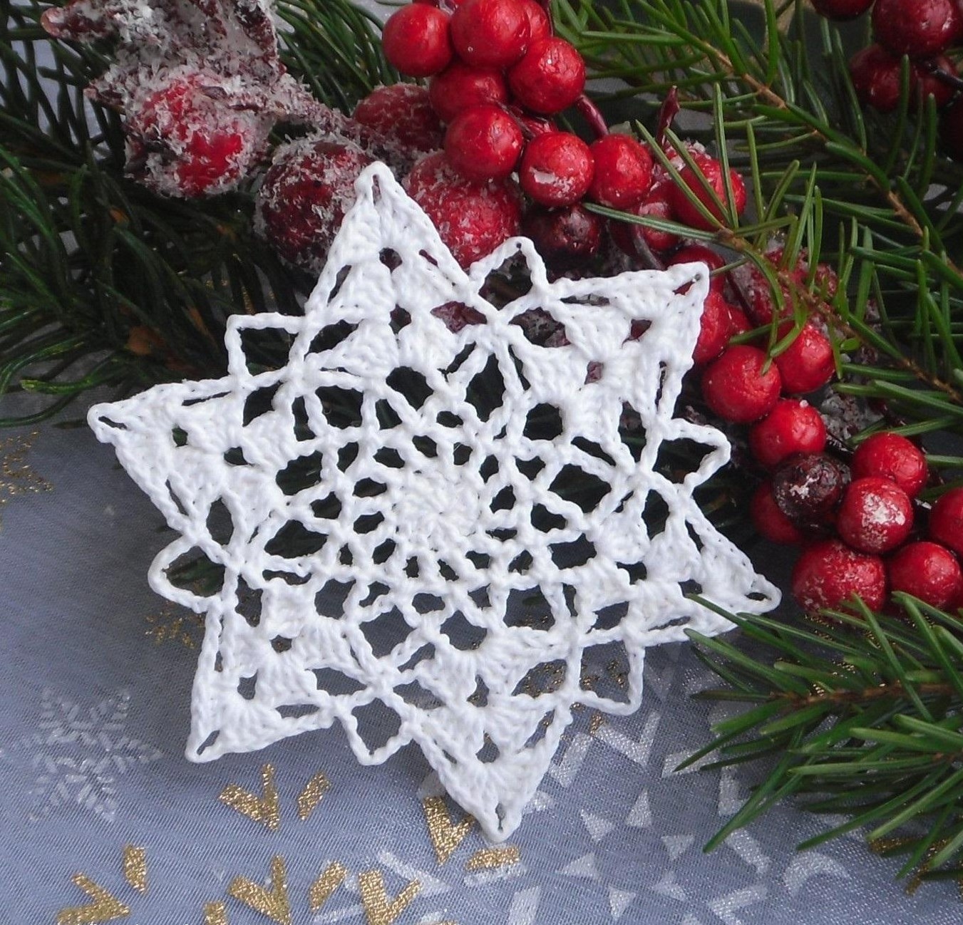 Ozdobte svůj domov touto sněhovou vločkou, určena do oken i na stromeček nebo girlandy. Nejvíce jí to sluší na oknech pro atmosféru sněhové nadílky. Popis : háčkovaná vločka z kvalitní příze, průměr 8 cm. Vlastnosti : silně a pečlivě škrobena, v kartonové krabičce chrastí. Použití : k zimní a vánoční dekoraci, vhodná k zavěšení na větvičku nebo do okna, na věnec nebo na stromeček, dále k uvázání na dárky, dárek nebo pozornost např. kamarádce, podložka např. pod svícen. Doporučení: z vloček a dalších motivů si vytvořte svou vlastní vánoční sadu. Tip : háčkované ozdoby jsou oblíbeným symbolem vánoc pro svou tradici a jemnost .