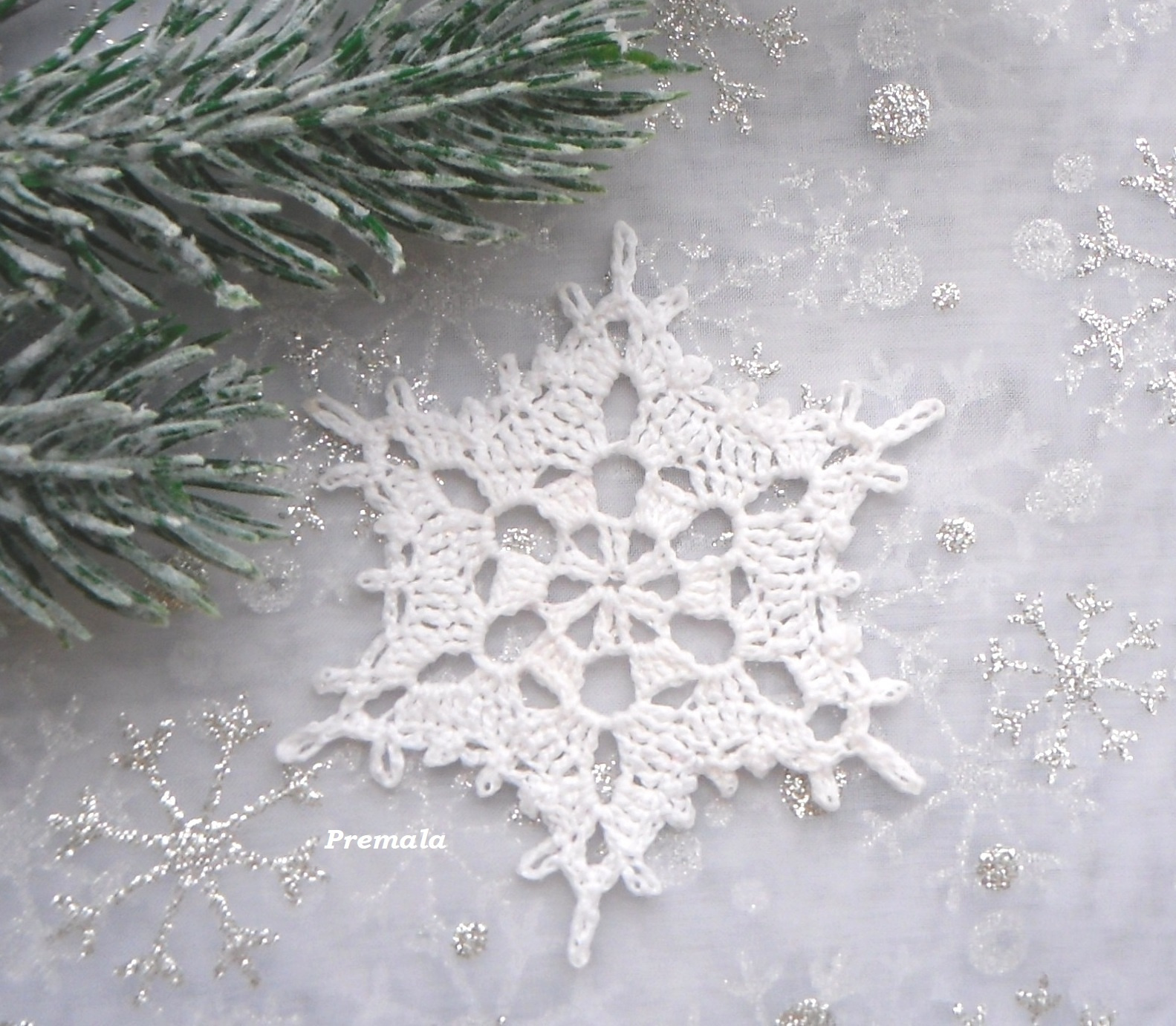 Popis: háčkovaná vločka z kvalitní příze, průměr 8 cm.